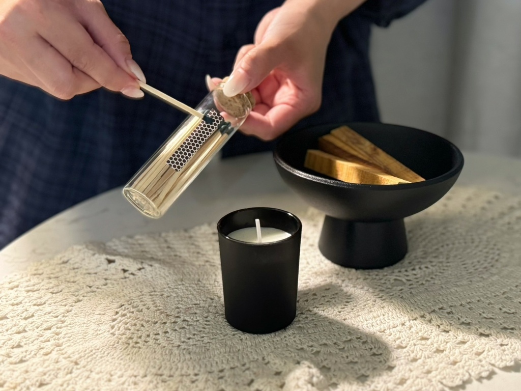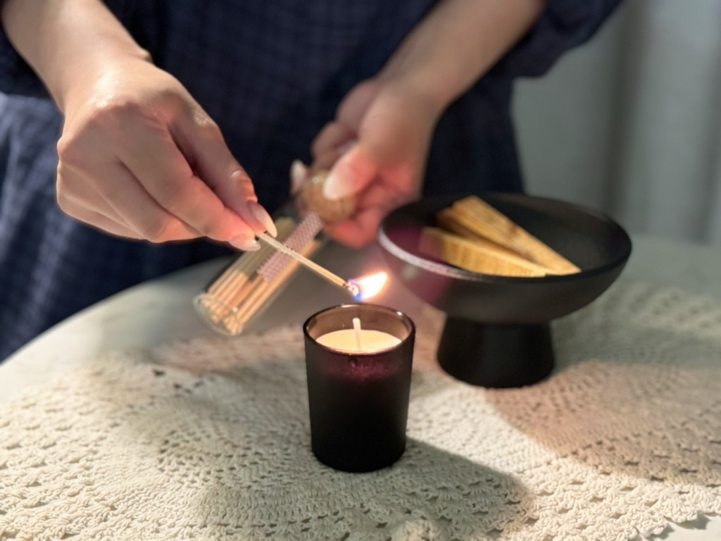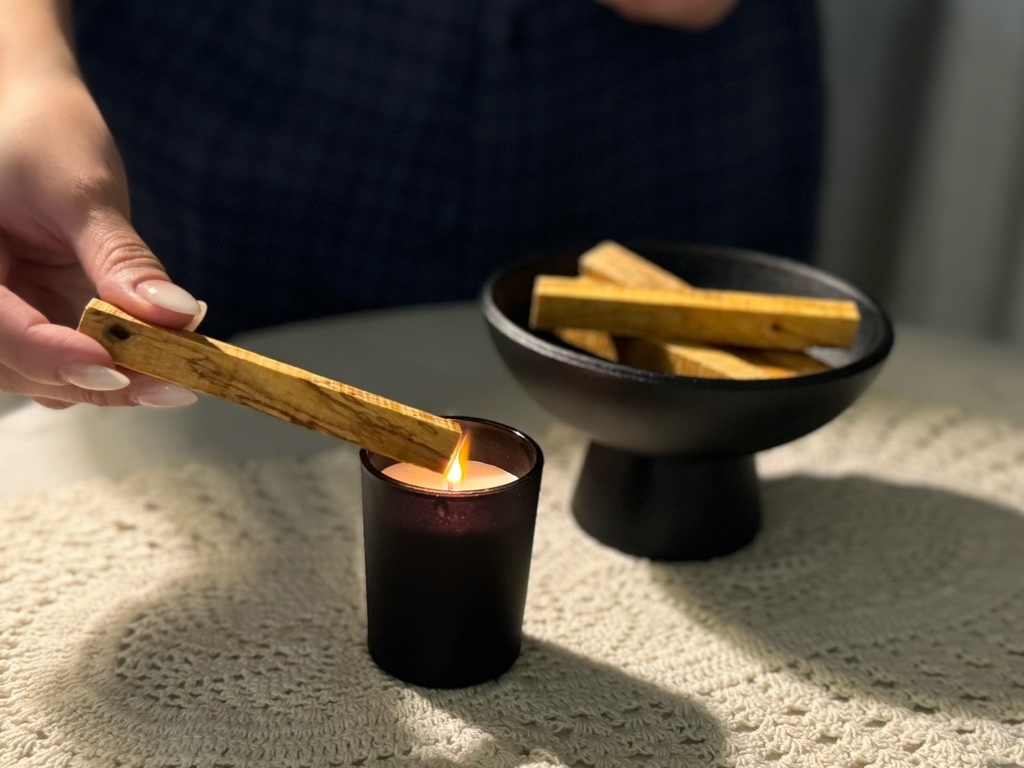 ( 貼心小提醒,因為點燃時蠟燭和聖木會有火源,建議要將其放置於家中孩童或是毛孩觸碰不到的地方才安全哦~ )