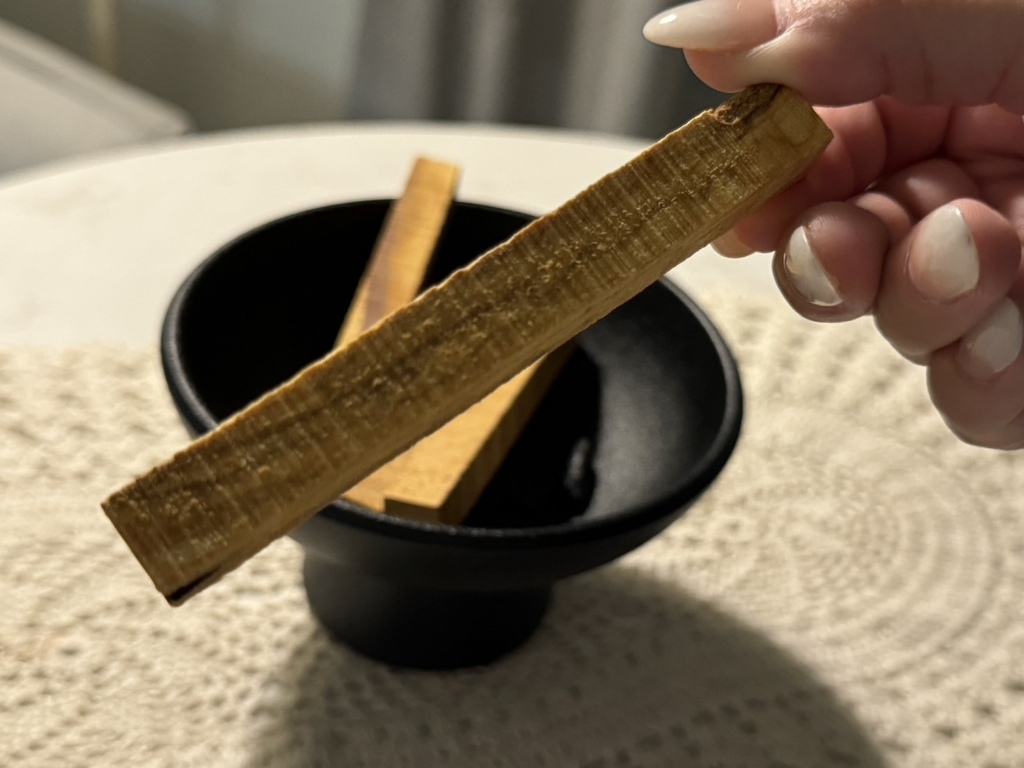 而那個小小的木頭就叫做秘魯聖木,它是一種燃燒後會產生獨特香味的神奇樹木,可以讓生活空間充滿清新舒適,也可以帶給身心靈愉悅和安寧,所以經常被廣泛用來與瑜伽結合。