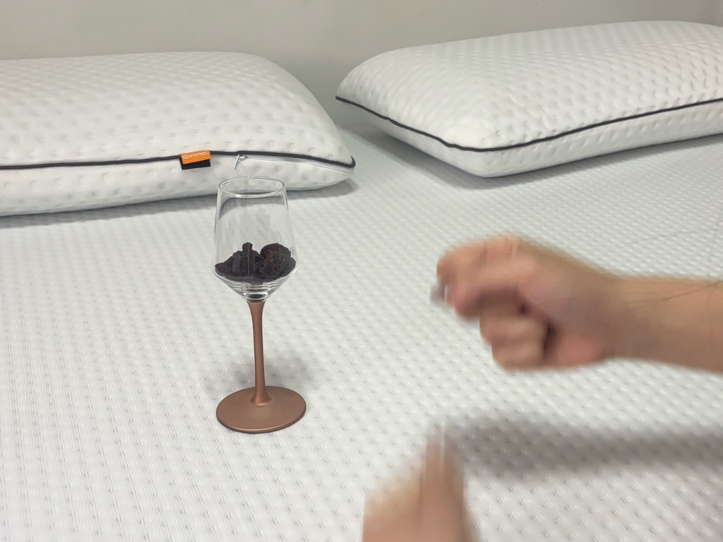 連續睡了幾天,我發現德國Emma石墨烯黑鑽床墊干擾性真的很低,就算枕邊人半夜翻身、調整睡姿,我幾乎感覺不到明顯晃動,這次我還特地為了更科學驗證,拿了高腳杯放在床墊上做"干擾測試",無論是大動作翻身,還是用力敲打杯子附近的床墊區域,高腳杯依然穩得驚人,幾乎沒有晃動更別說翻倒了,實測直接滿分過關!