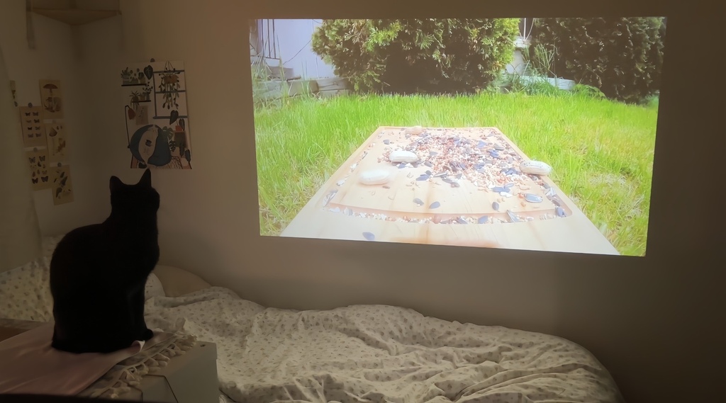 入手這台SANSUI 山水 SPJ-MO 微型行動高亮度智慧投影機,不只是我們全家開心,就連貓主子都天天報到搶位!